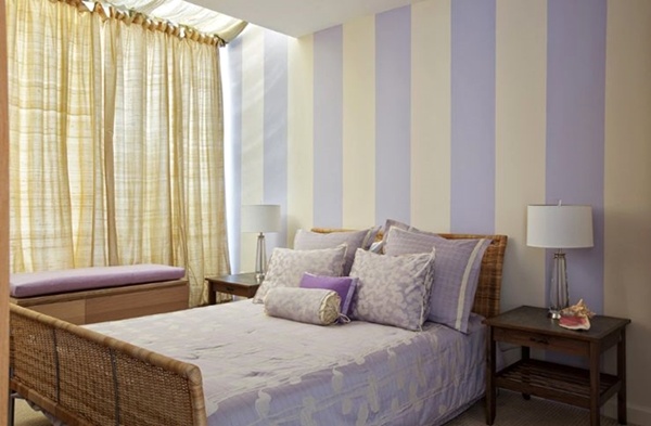 Căn phòng ngủ nữ tính với bộ ga trải giường màu tím nhạt đã trở nên độc đáo hơn nhờ những sọc sơn tím xen kẽ trên tường, một cách trang điểm đơn giản mà vẫn đem lại sự khác biệt.