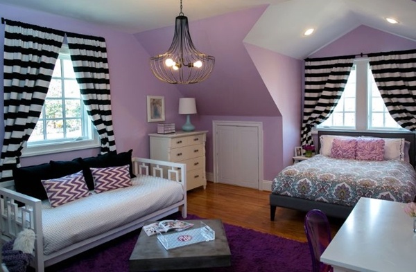 Cũng là họa tiết kẻ và sắc tím nhưng căn phòng trên đây có nét trẻ trung pha lẫn phong cách cổ điển khi kết hợp rèm cửa kẻ ngang và màu tím phủ kín các bức tường.