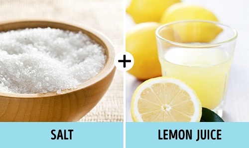 Nước muối sẽ giúp bạn tạm biệt những vết ố, rỉ sét lâu ngày. Chỉ cần đổ vào những chỗ rỉ, kỳ cọ kỹ, vắt thêm chanh lên trên. Nước chanh sẽ phản ứng với rỉ rồi hòa tan nó, còn muối sẽ hấp thụ phần còn lại. Hãy thực hiện vào ban đêm và làm sạch vào buổi sáng.
