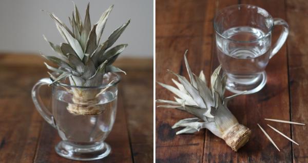 Cắm vài chiếc tăm vào phần thân của cụm lá dứa. Đặt chúng đối diện nhau và gần ở phần đỉnh của thân. Cắm tăm vào sâu một chút để chúng không bị lệch sang vị trí khác. Sau đó thả phần cuống dứa đã cắm tăm này vào chiếc cốc đã có nước. Những chiếc tăm này sẽ giúp cho phần lá dứa ở phía trên mặt nước và phần thân ở bên dưới mặt nước để giúp cây không bị thối.