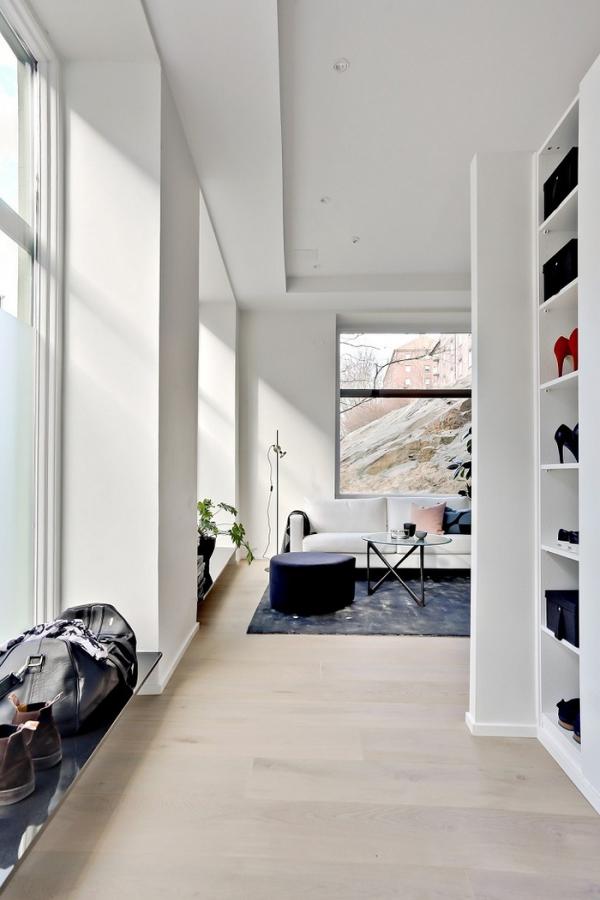 Căn hộ tuy có diện tích vừa phải nhưng bằng nhiều giải pháp được tích hợp một cách thông minh đủ giúp cho tổ ấm thêm rộng rãi gấp nhiều lần so với diện tích thực. Lối vào nhà khá thông thoáng, ánh sáng tự nhiên ngập tràn giúp tông chủ đạo với màu trắng của toàn bộ căn hộ tạo nên vẻ đẹp hiện đại và thoáng sáng.