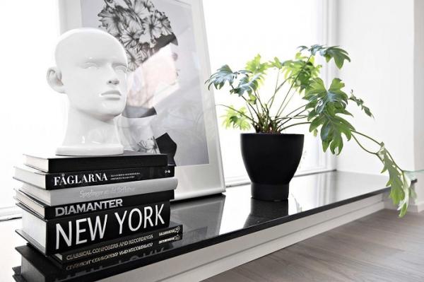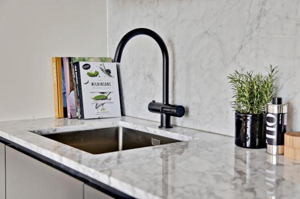 Bàn bếp được ốp đá cẩm thạch mang đến vẻ đẹp sạch sẽ, sang trọng cho không gian nấu nướng. Thêm sự hiện diện của những chậu cây nhỏ xinh, những cuốn sách nhỏ đủ để góc chức năng này thêm đẹp ấn tượng.