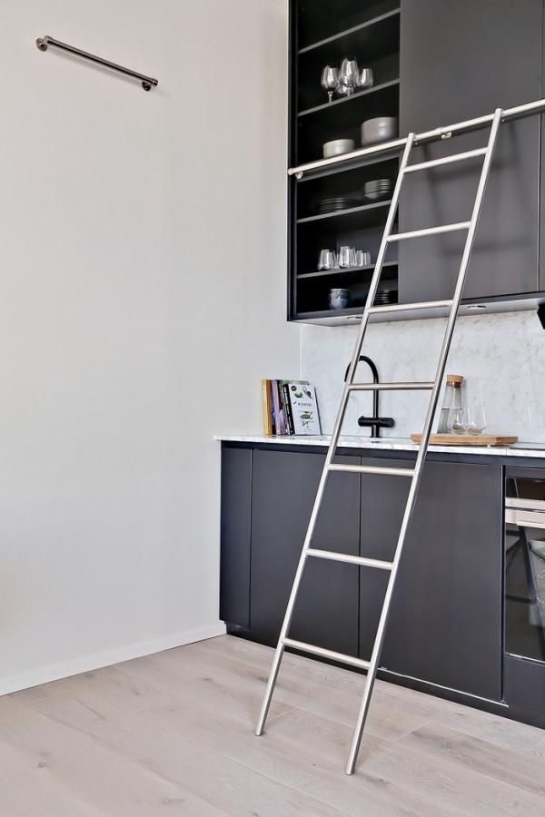 Thêm thang inox có thể di chuyển dễ dàng mọi nơi mọi chốn giúp đồ dùng trên các ngăn tủ cao có thể được lấy xuống sử dụng một cách nhanh chóng và tiện lợi.