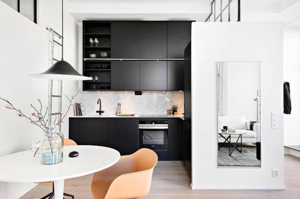 Bên cạnh nơi ăn uống là bếp nấu được sử dụng màu đen làm màu nền. Hệ thống tủ bếp được lắp đặt cho toàn bộ bức tường giúp mọi vật dụng, đồ dùng trong bếp được gọn gàng và rộng thoáng. Chỉ giữ lại mặt bàn tủ làm nơi nấu nướng, rửa đồ tiện lợi.