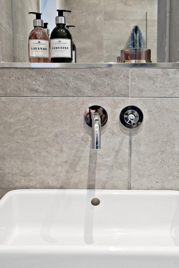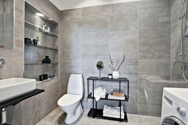 Tách biệt với các khu vực chức năng khác, phòng tắm được thiết kế khá ấn tượng với gam màu ghi xám làm chủ đạo để tạo cảm giác tĩnh tại, thư giãn.