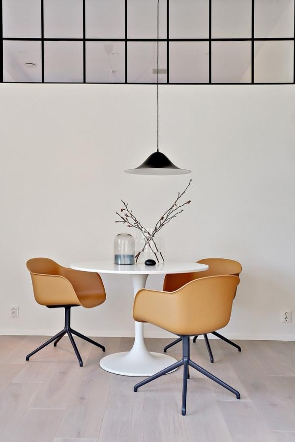 Tiếp nối với không gian phòng khách là nơi dành cho việc nấu nướng, ăn uống hàng ngày của gia đình. Bộ bàn ăn với những chiếc ghế có đường cong mềm mại, màu sắc giản dị nhưng cũng đủ để không gian ăn uống của gia đình đẹp tinh tế và không kém phần ấm cúng.