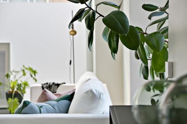 Chậu cây xanh được đặt sát bệ cửa sổ, với tán lá nhỏ giúp mọi người trong nhà được gần hơn với thiên nhiên, hoa cỏ. Màu xanh của cây xanh cũng trở nên nổi bật đầy ấn tượng trong không gian nền trắng tinh khôi của toàn bộ căn hộ.