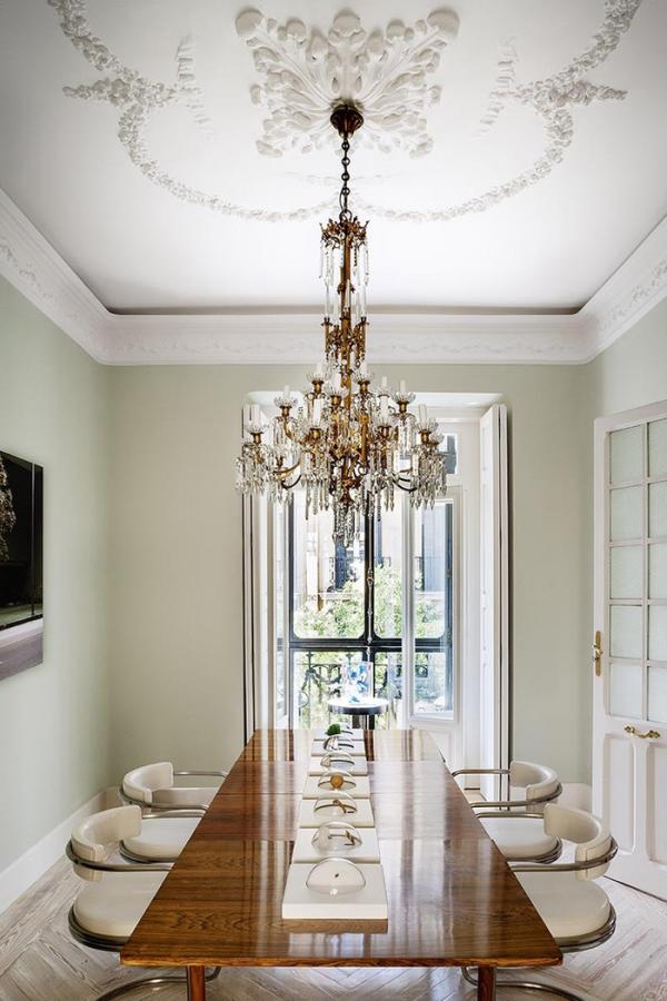 Phòng ăn uống hàng ngày của gia đình được bố trí ngay cạnh phòng bếp với nội thất đường nét tinh tế. Thêm những hoa văn họa tiết bằng thạch cao sáng tạo trên trần giúp góc ăn uống của gia đình đẹp độc đáo. Sự linh hoạt trong cách chọn lựa nhiều sắc độ của be cho tường nhà, trần nhà, nội thất giúp không gian ăn uống đẹp sang trọng nhưng vẫn có chút phảng phất dung dị, gần gũi của Retro.