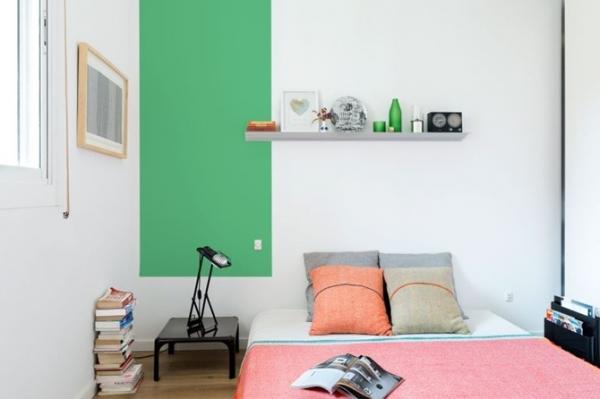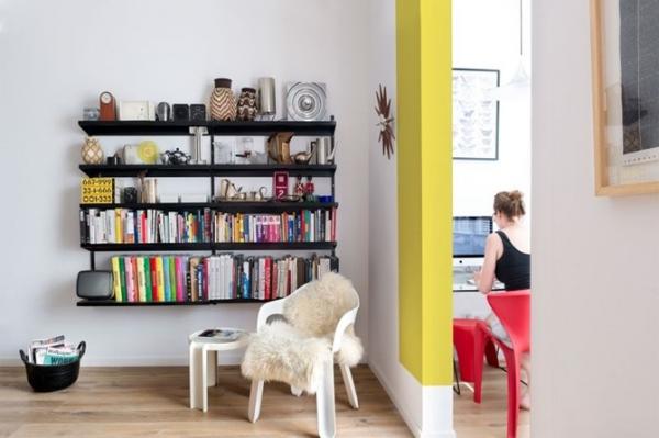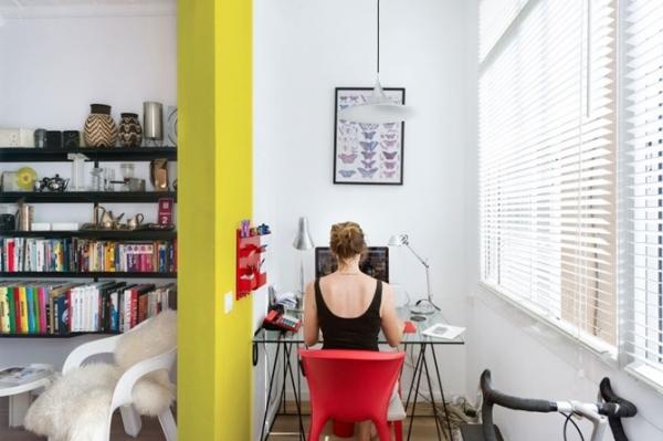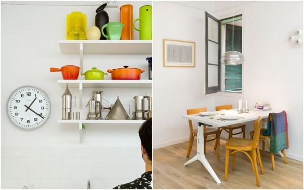 Mỗi không gian trong căn hộ đều có một món đồ màu sắc để làm điểm nhấn, từ chiếc ghế sofa xanh ngọc trong phòng khách, chiếc ghế đỏ nơi góc làm việc, hay bộ bát đĩa đa màu sắc đặt trên giá bếp… Ngay cả những bức tường cũng không hẳn được phủ trắng toàn bộ mà được điểm xuyết bởi những ô vuông hình chữ nhật màu vàng hay xanh lá.