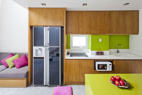 Một góc nhà bếp. Bếp được đặt ngay ở tầng 1 cùng với phòng khách. Sử dụng màu sắc rực rỡ đem lại cảm giác ấm cúng và tươi trẻ cho căn phòng.