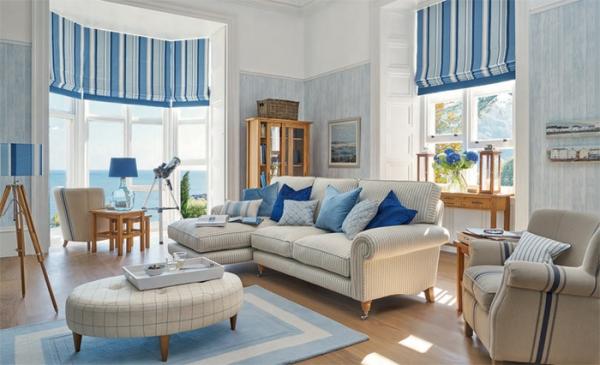 Tường của phòng khách được thiết kế khá ấn tượng với hai màu cơ bản xanh biển và trắng. Xanh biển cho phần dưới của tường và trắng cho trần và một phần tường tựa như sự kết nối của biển cả với bầu trời trong mây trắng bồng bềnh.