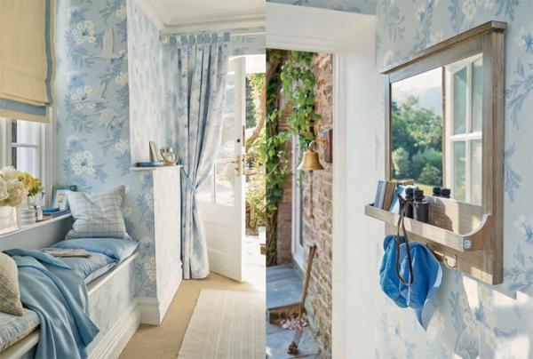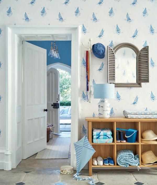 Chọn giấy dán tường với họa tiết những cánh buồm để trang trí cho lối vào, không gian nhỏ từ cửa vào nhà trở nên sinh động khi được điểm xuyết với màu xanh nước biển. Màu trắng ngà vừa tạo sự rộng rãi, thoáng sáng cho không gian vừa giúp những họa tiết xanh biển thêm nổi bật.