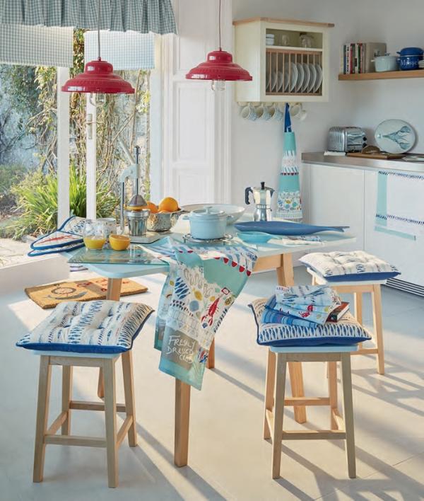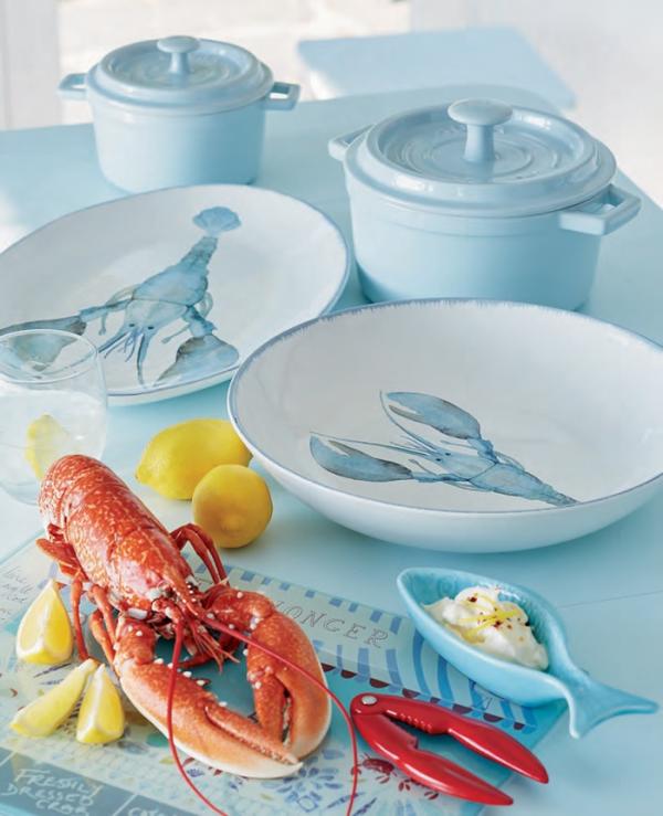 Bộ đồ ăn cũng được chọn lựa với gam màu xanh biển nhạt, họa tiết sinh vật biển để tạo sự kết nối nhẹ nhàng, đáng yêu cho cuộc sống hàng ngày của mọi người trong nhà.