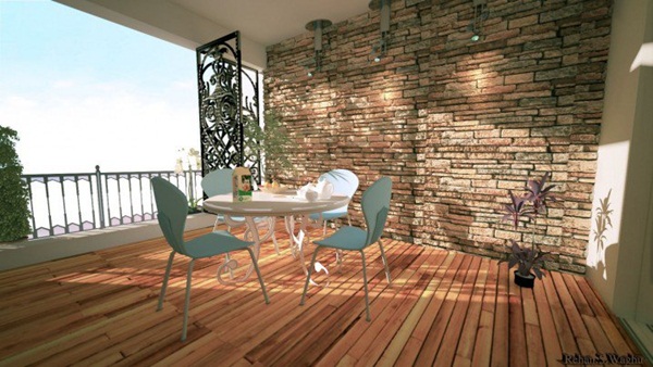 9. Ban công là khoảng không cho phép bạn thư giãn, ngắm mây nhìn trời mà không cần phải bước ra khỏi ngôi nhà của mình. Những chiếc bàn, ghế tựa, ghế dài bằng gỗ nền nã khiến những lọ hoa xinh trở thành điểm nhấn thật vui mắt.